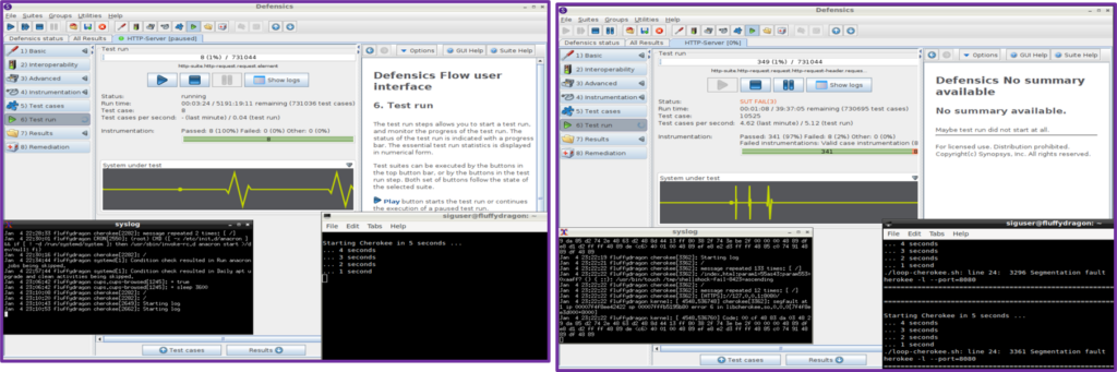 Test aşamasında Defensics, seçilen gruplardaki tüm test senaryolarını çalıştırır; hedefe düzgün biçimlendirilmiş mesajlar gönderilir ve geçerli yanıtlar aranır.