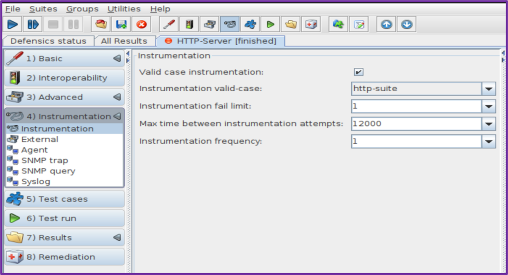 Defensics testlerinde enstrümantasyon çok önemlidir, çünkü test senaryosunun sonucu, hedefte bir hata olup olmadığı enstrümantasyon tarafından belirlenir. Bunun için birçok seçenek vardır, ancak örneğin HTTP veya IPv4 için “Geçerli durum enstrümantasyonu” başlangıç için yeterlidir. Farklı enstrümantasyon yöntemleri, test edilen sistemi farklı şeyler açısından izler ve bunların çoğu ek yapılandırma gerektirir. Kullanılan enstrümantasyon teknikleri:
