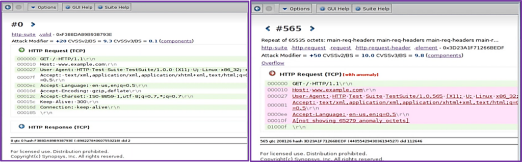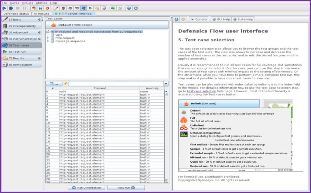 Defensics’in farklılaştırıcı özelliklerinden biri, her bir testin, test paketi tarafından deterministik olarak oluşturulmasıdır. Yani, testler rastgele oluşturulmuyor. Defensics, test senaryolarını içerdikleri anomali türüne göre gruplandırır; varsayılan olarak 700.000 test içerdiğini görebilirsiniz.