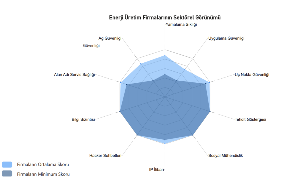 Öne çıkan bulgular; firmaların genel siber güvenlik skorları orta–iyi seviyede olmakla birlikte, sektör ortalamasının altında kalan alanlar bulunmaktadır. Uygulama güvenliği, ağ güvenliği ve yamalama sıklığı, iyileştirme ihtiyacının en fazla olduğu risk alanlarıdır. Uç nokta güvenliği ve IP itibarı başlıklarında firmalar görece daha olgun bir seviyededir.